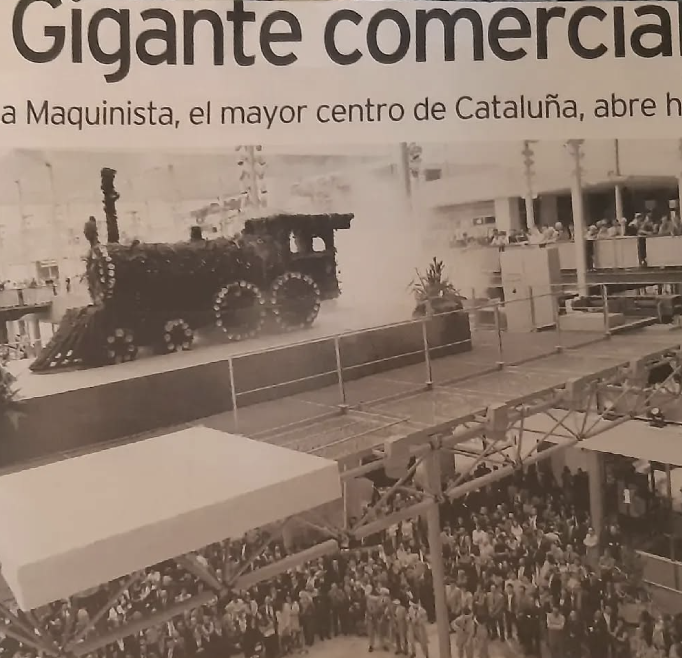 Obra realitzada fa més de 25 anys com a emblema i inauguració del centre comercial La Maquinista, vinculada a la memòria industrial del lloc.